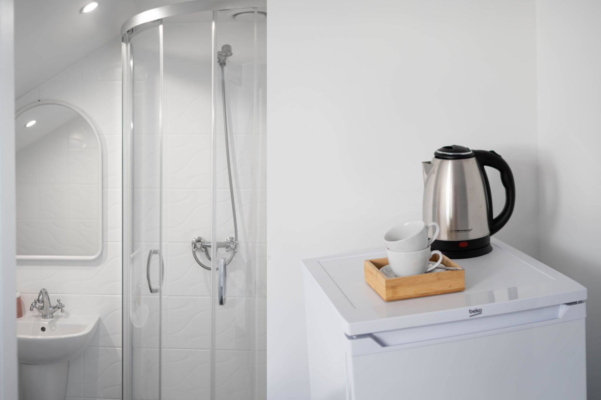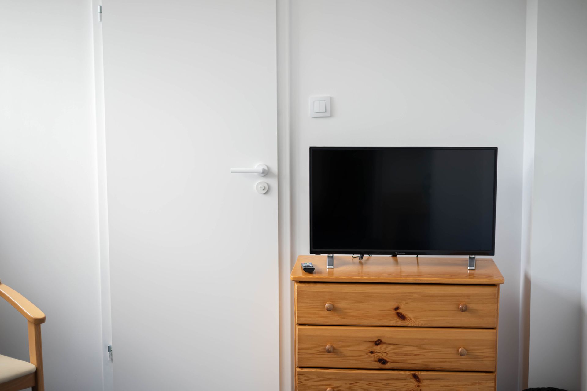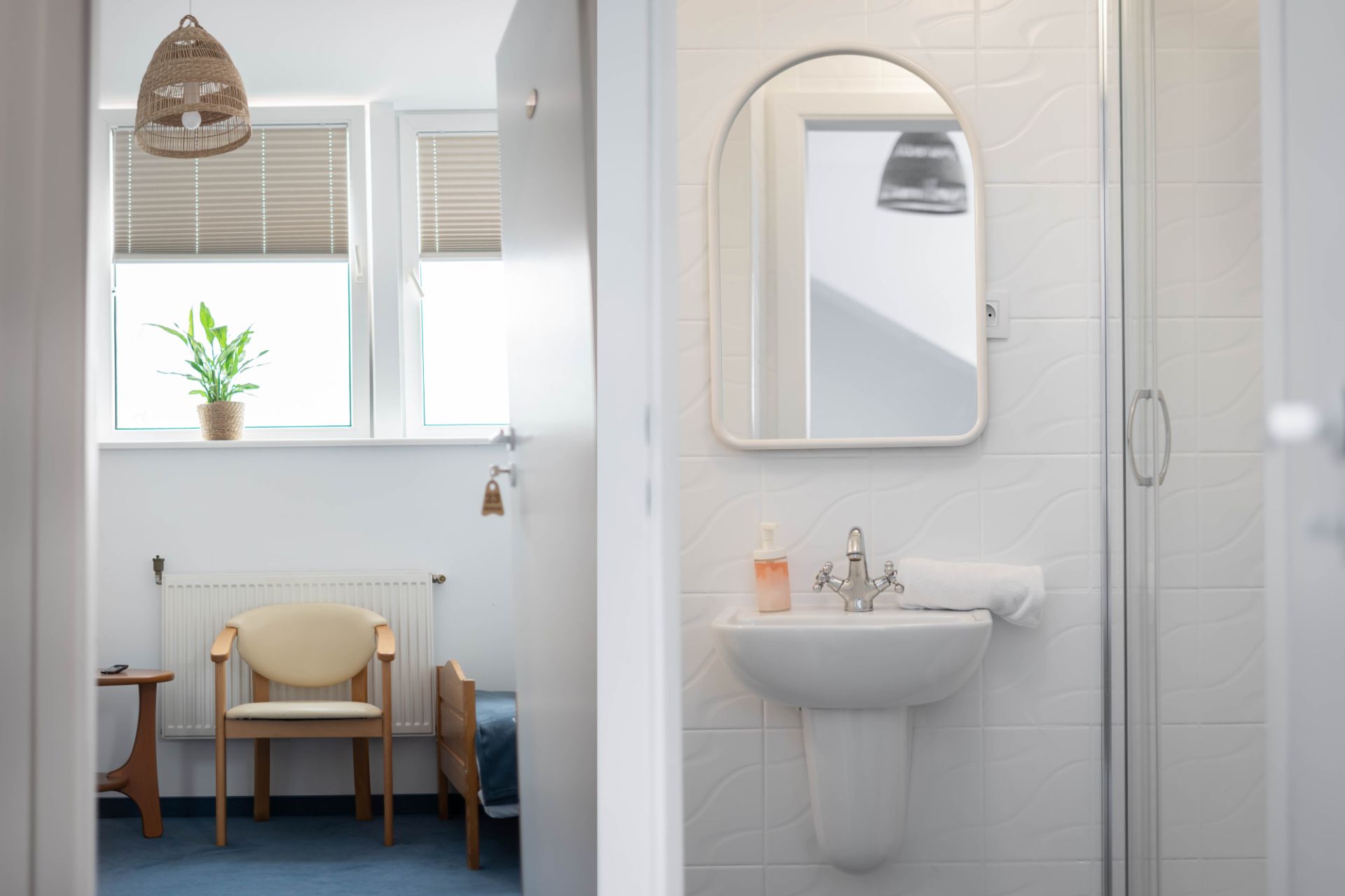 Pokój w hotelu położonym w spokojnej okolicy nad jeziorem, z bezpośrednim dostępem do plaży i bliskością lasu. To dobre miejsce dla osób, które chcą odpocząć nad wodą i spędzić czas w otoczeniu natury.